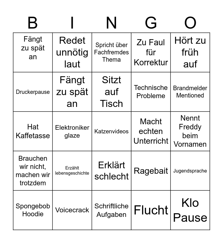 This bingo card has a free space and 24 words: Erzählt lebensgeschichte, Voicecrack, Sitzt auf Tisch, Spongebob Hoodie, Hört zu früh auf, Fängt zu spät an, Druckerpause, Redet unnötig laut, Macht echten Unterricht, Erklärt schlecht, Technische Probleme, Hat Kaffetasse, Ragebait, Jugendsprache, Fängt zu spät an, Flucht, Nennt Freddy beim Vornamen, Spricht über Fachfremdes Thema, Brandmelder Mentioned, Elektroniker glaze, Klo Pause, Brauchen wir nicht, machen wir trotzdem, Zu Faul für Korrektur and Schriftliche Aufgaben.