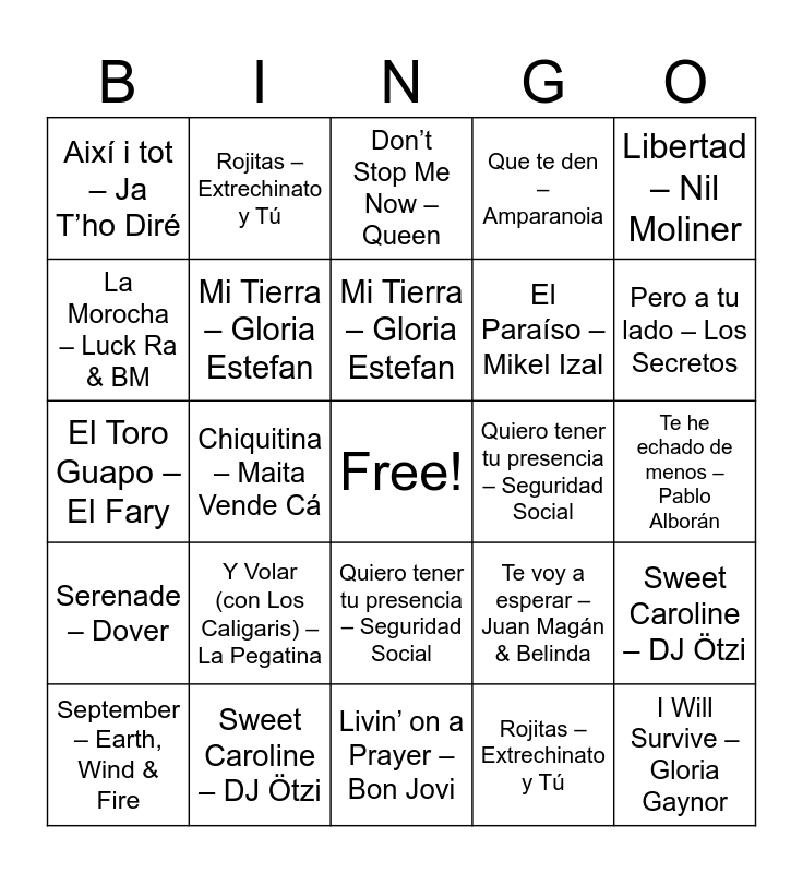 ⚠ This card has duplicate items: Te voy a esperar – Juan Magán & Belinda (2), Sweet Caroline – DJ Ötzi (2), Ay Mamá – Rigoberta Bandini (2), El Toro Guapo – El Fary (2), Rojitas – Extrechinato y Tú (2), Salir – Extremoduro (2), Mi Tierra – Gloria Estefan (2), Tu Calorro – Estopa (2), Quiero tener tu presencia – Seguridad Social (2), Carolina – M-Clan (2), Te he echado de menos – Pablo Alborán (2), Libertad – Nil Moliner (2), Pero a tu lado – Los Secretos (2), La Morocha – Luck Ra & BM (2), Chiquitina – Maita Vende Cá (2), Aixà i tot – Ja T’ho Diré (2), Potra Salvaje – Isabel Aaiún (2), El ParaÃso – Mikel Izal (2), Y Volar (con Los Caligaris) – La Pegatina (2), Serenade – Dover (2), Que te den – Amparanoia (2), Atrévete-te-te – Calle 13 (2), Dancing Queen – ABBA (2), Mamma Mia – ABBA (2), Don’t Stop Me Now – Queen (2), Livin’ on a Prayer – Bon Jovi (2), I Will Survive – Gloria Gaynor (2), Y.M.C.A. – Village People (2), September – Earth, Wind & Fire (2), Uptown Girl – Billy Joel (2), Wake Me Up Before You Go-Go – Wham! (2), Can’t Stop the Feeling! – Justin Timberlake (2)