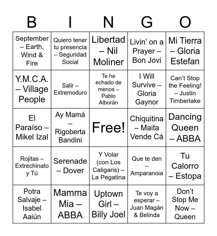 This bingo card has a free space and 32 words: Te voy a esperar – Juan Magán & Belinda, Sweet Caroline – DJ Ötzi, Ay Mamá – Rigoberta Bandini, El Toro Guapo – El Fary, Rojitas – Extrechinato y Tú, Salir – Extremoduro, Mi Tierra – Gloria Estefan, Tu Calorro – Estopa, Quiero tener tu presencia – Seguridad Social, Carolina – M-Clan, Te he echado de menos – Pablo Alborán, Libertad – Nil Moliner, Pero a tu lado – Los Secretos, La Morocha – Luck Ra & BM, Chiquitina – Maita Vende Cá, Així i tot – Ja T’ho Diré, Potra Salvaje – Isabel Aaiún, El Paraíso – Mikel Izal, Y Volar (con Los Caligaris) – La Pegatina, Serenade – Dover, Que te den – Amparanoia, Atrévete-te-te – Calle 13, Dancing Queen – ABBA, Mamma Mia – ABBA, Don’t Stop Me Now – Queen, Livin’ on a Prayer – Bon Jovi, I Will Survive – Gloria Gaynor, Y.M.C.A. – Village People, September – Earth, Wind & Fire, Uptown Girl – Billy Joel, Wake Me Up Before You Go-Go – Wham! and Can’t Stop the Feeling! – Justin Timberlake.