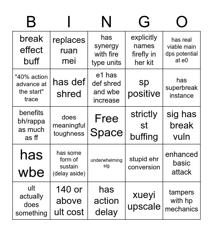 This bingo card has a free space and 24 words: ult actually does something, has some form of sustain (delay aside), e1 has def shred and wbe increase, xueyi upscale, has real viable main dps potential at e0, break effect buff, replaces ruan mei, has synergy with fire type units, strictly st buffing, sig has break vuln, benefits bh/rappa as much as ff, has def shred, stupid ehr conversion, enhanced basic attack, "40% action advance at the start" trace, 140 or above ult cost, has action delay, explicitly names firefly in her kit, has superbreak instance, has wbe, does meaningful toughness, underwhelming sig, sp positive and tampers with hp mechanics.