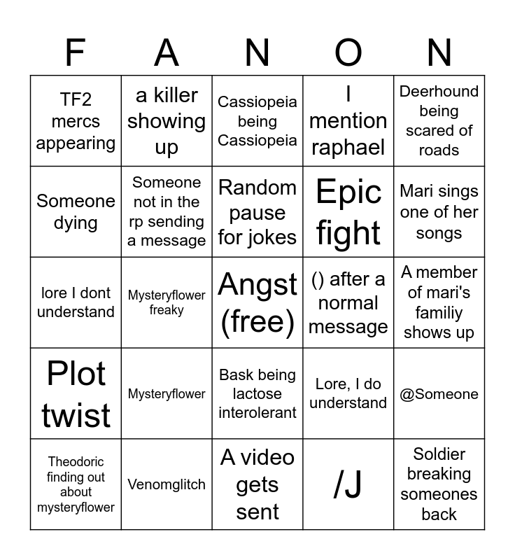 This bingo card has a free space and 24 words: Mysteryflower, Venomglitch, Random pause for jokes, Theodoric finding out about mysteryflower, Deerhound being scared of roads, TF2 mercs appearing, Someone dying, a killer showing up, () after a normal message, Bask being lactose interolerant, Epic fight, lore I dont understand, Lore, I do understand, @Someone, Someone not in the rp sending a message, /J, A member of mari's familiy shows up, Cassiopeia being Cassiopeia, Mari sings one of her songs, Mysteryflower freaky, Soldier breaking someones back, Plot twist, I mention raphael and A video gets sent.