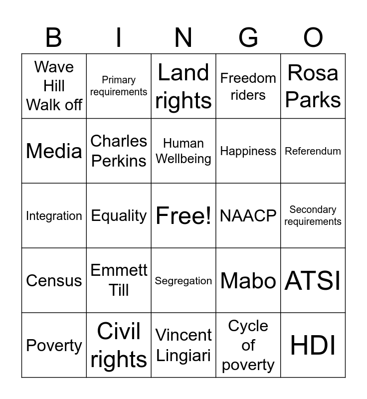 This bingo card has a free space and 24 words: Emmett Till, Civil rights, Human Wellbeing, Poverty, Rosa Parks, Wave Hill Walk off, Media, Primary requirements, NAACP, Segregation, Happiness, Integration, Mabo, ATSI, Charles Perkins, Cycle of poverty, Secondary requirements, Land rights, Referendum, Equality, HDI, Census, Freedom riders and Vincent Lingiari.