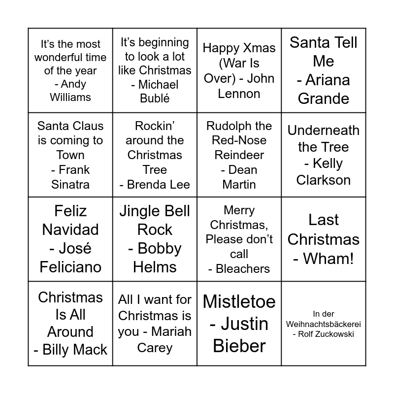This bingo card has 16 words: All I want for Christmas is you - Mariah Carey, Last Christmas - Wham!, Happy Xmas (War Is Over) - John Lennon, It’s the most wonderful time of the year - Andy Williams, Feliz Navidad - José Feliciano, It’s beginning to look a lot like Christmas - Michael Bublé, Merry Christmas, Please don’t call - Bleachers, Mistletoe - Justin Bieber, Santa Claus is coming to Town - Frank Sinatra, Rockin’ around the Christmas Tree - Brenda Lee, Christmas Is All Around - Billy Mack, Santa Tell Me - Ariana Grande, Jingle Bell Rock - Bobby Helms, Underneath the Tree - Kelly Clarkson, Rudolph the Red-Nose Reindeer - Dean Martin and In der Weihnachtsbäckerei - Rolf Zuckowski.