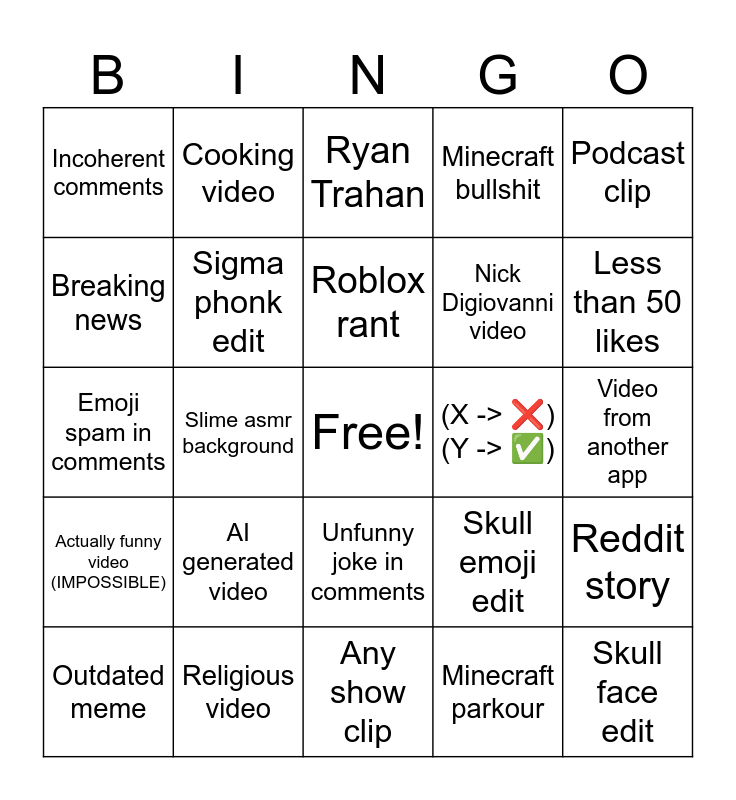 This bingo card has a free space and 34 words: Indian short, Minecraft parkour, GTA car driving, Shitty mobile game, Actually funny video (IMPOSSIBLE), Sigma phonk edit, Podcast clip, Outdated meme, Cooking video, Comments have horrible grammar, Roblox rant, Ryan Trahan, Mr Beast, 4 year old begging for subs, (X -> ❌) (Y -> ✅), Less than 50 likes, Religious video, Emoji spam in comments, AI generated video, Skull emoji edit, Unfunny joke in comments, Bot comments, Incoherent comments, Video from another app, Any show clip, Skull face edit, Minecraft bullshit, Zach Choi video (guaranteed), Nick Digiovanni video, Breaking news, Russia, Slime asmr background, Reddit story and Glass bottle falling down stairs.