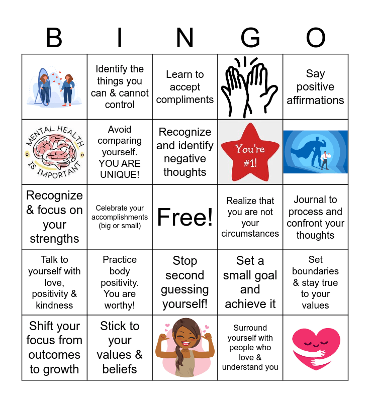 This bingo card has 8 images, a free space and 24 words: Surround yourself with people who love & understand you, Forgive yourself & your past mistakes, Celebrate your accomplishments (big or small), Identify your needs, wants & hopes, Talk to yourself with love, positivity & kindness, Avoid comparing yourself. YOU ARE UNIQUE!, Say positive affirmations, Set boundaries & stay true to your values, Identify the things you can & cannot control, Practice ways to create calm & peace within yourself, Recognize and identify negative thoughts, Learn to accept compliments, Develop a daily gratitude practice, Take back control over your own feelings, Realize that you are not your circumstances, Avoid toxic/negative people & places that make you feel badly about yourself, Shift your focus from outcomes to growth, Recognize & focus on your strengths, Stop second guessing yourself!, Practice body positivity. You are worthy!, Set a small goal and achieve it, Explore new hobbies, try new things!, Journal to process and confront your thoughts and Stick to your values & beliefs.
