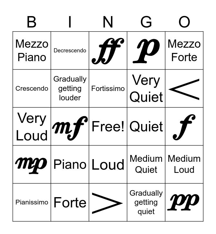This bingo card has 8 images, a free space and 16 words: Piano, Forte, Fortissimo, Pianissimo, Mezzo Forte, Mezzo Piano, Crescendo, Decrescendo, Quiet, Loud, Very Quiet, Very Loud, Medium Quiet, Medium Loud, Gradually getting louder and Gradually getting quiet.
