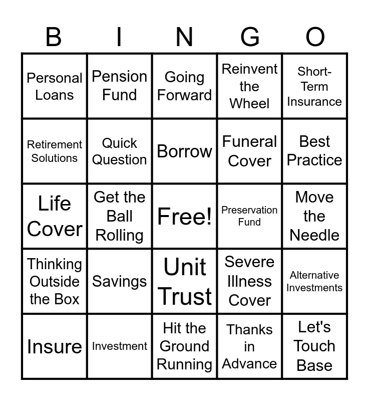 This bingo card has a free space and 24 words: Savings, Investment, Borrow, Insure, Short-Term Insurance, Personal Loans, Retirement Solutions, Pension Fund, Preservation Fund, Unit Trust, Funeral Cover, Life Cover, Severe Illness Cover, Alternative Investments, Quick Question, Thanks in Advance, Move the Needle, Going Forward, Best Practice, Get the Ball Rolling, Let's Touch Base, Thinking Outside the Box, Reinvent the Wheel and Hit the Ground Running.