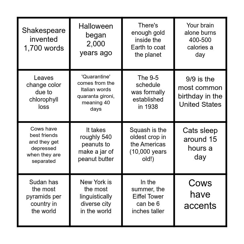 This bingo card has 16 words: New York is the most linguistically diverse city in the world, Cats sleep around 15 hours a day, There's enough gold inside the Earth to coat the planet, Shakespeare invented 1,700 words, Cows have best friends and they get depressed when they are separated, Halloween began 2,000 years ago, Squash is the oldest crop in the Americas (10,000 years old!), In the summer, the Eiffel Tower can be 6 inches taller, Leaves change color due to chlorophyll loss, 'Quarantine' comes from the Italian words quaranta gironi, meaning 40 days, Sudan has the most pyramids per country in the world, Your brain alone burns 400-500 calories a day, It takes roughly 540 peanuts to make a jar of peanut butter, 9/9 is the most common birthday in the United States, The 9-5 schedule was formally established in 1938 and Cows have accents.