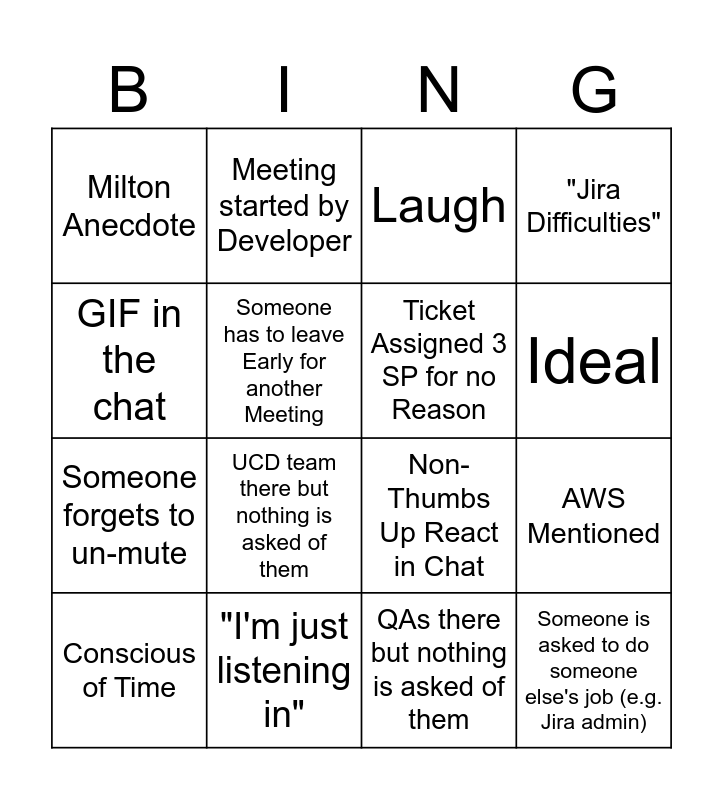 This bingo card has 53 words: Duplicate Ticket, Conscious of Time, Let's have a great day, Overrun Time, BRB, Loud Background Noise, Meeting started by Developer, Someone Pivotal to refining the Ticket is not in the Meeting, Someone has to leave Early for another Meeting, Refreshing SCRUM Poker Over and Over again instead of just Clicking Delete Estimates, Ticket Assigned 3 SP for no Reason, Ticket gets Discarded, Someone says that's a Product Question, Someone is called out for not Pointing a Ticket, Release Train Mentioned, SCRUM Poker scores Revealed before everyone has finished voting, Ideal, "I'm just listening in", AC said too quickly for host to type, GIF in the chat, AWS Mentioned, Ticket gets linked to another ticket, Someone forgets to un-mute, Milton Anecdote, Hand up, Too long on a ticket (15 mins), Verbatim reads description to explain ticket, Someone gets talked over/interupted, "Attack"/"Weapon", UCD team there but nothing is asked of them, "[yeah, but no]", "Could you repeat that?" (Not listening), Talk about old/in-progress tickets, Dean is doing something important and does not hear, Points assigned without unanimous vote, Concern raised but swept under the rug, "Jira Difficulties", Someone arrives 5+ mins late, Laugh, 5+ min unrelated starting chat, WebOps mentioned, Comment left on ticket, QAs there but nothing is asked of them, Thats a BA question, Ticket assigned to Developer, Backlog ticket added to current sprint, Non BG member mentioned, Thumbs Up React in Chat, Non-Thumbs Up React in Chat, Someone is asked to do someone else's job (e.g. Jira admin), No one offers to be assigned to a ticket, "Let me start screen sharing" and "Thanks everyone".