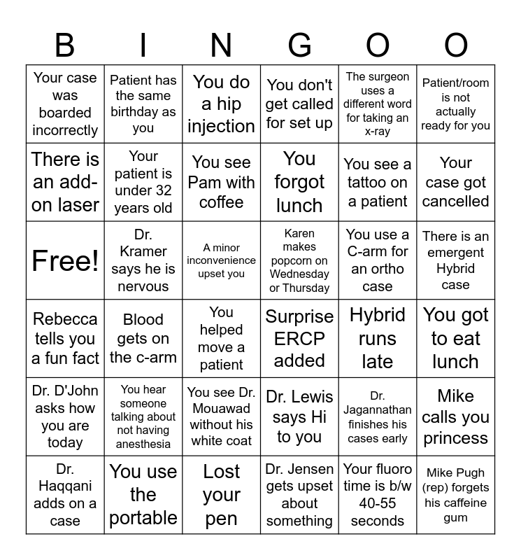 This bingo card has 36 words: Dr. Lewis says Hi to you, You see Dr. Mouawad without his white coat, Dr. Jensen gets upset about something, There is an add-on laser, Rebecca tells you a fun fact, Karen makes popcorn on Wednesday or Thursday, Your patient is under 32 years old, Lost your pen, The surgeon uses a different word for taking an x-ray, Dr. Jagannathan finishes his cases early, Your case got cancelled, You don't get called for set up, Mike calls you princess, Dr. Kramer says he is nervous, You forgot lunch, Your case was boarded incorrectly, Dr. D'John asks how you are today, You use a C-arm for an ortho case, Free!, You do a hip injection, A minor inconvenience upset you, Blood gets on the c-arm, Surprise ERCP added, You helped move a patient, Hybrid runs late, Patient has the same birthday as you, You see a tattoo on a patient, You use the portable, You see Pam with coffee, Patient/room is not actually ready for you, Mike Pugh (rep) forgets his caffeine gum, Dr. Haqqani adds on a case, You got to eat lunch, There is an emergent Hybrid case, You hear someone talking about not having anesthesia and Your fluoro time is b/w 40-55 seconds.