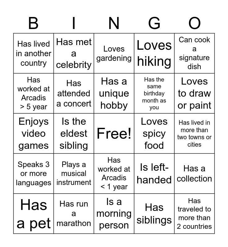 This bingo card has a free space and 24 words: Plays a musical instrument, Has run a marathon, Has a unique hobby, Has a pet, Can cook a signature dish, Has lived in another country, Has worked at Arcadis > 5 year, Has met a celebrity, Loves spicy food, Has worked at Arcadis < 1 year, Has the same birthday month as you, Enjoys video games, Is left-handed, Has a collection, Has attended a concert, Has siblings, Has lived in more than two towns or cities, Loves gardening, Loves to draw or paint, Is the eldest sibling, Has traveled to more than 2 countries, Speaks 3 or more languages, Loves hiking and Is a morning person.