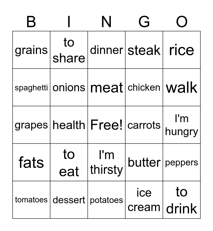 This bingo card has a free space and 24 words: to eat, dessert, meat, tomatoes, rice, grains, spaghetti, to share, carrots, I'm thirsty, chicken, grapes, butter, peppers, onions, ice cream, I'm hungry, dinner, walk, health, to drink, fats, steak and potatoes.