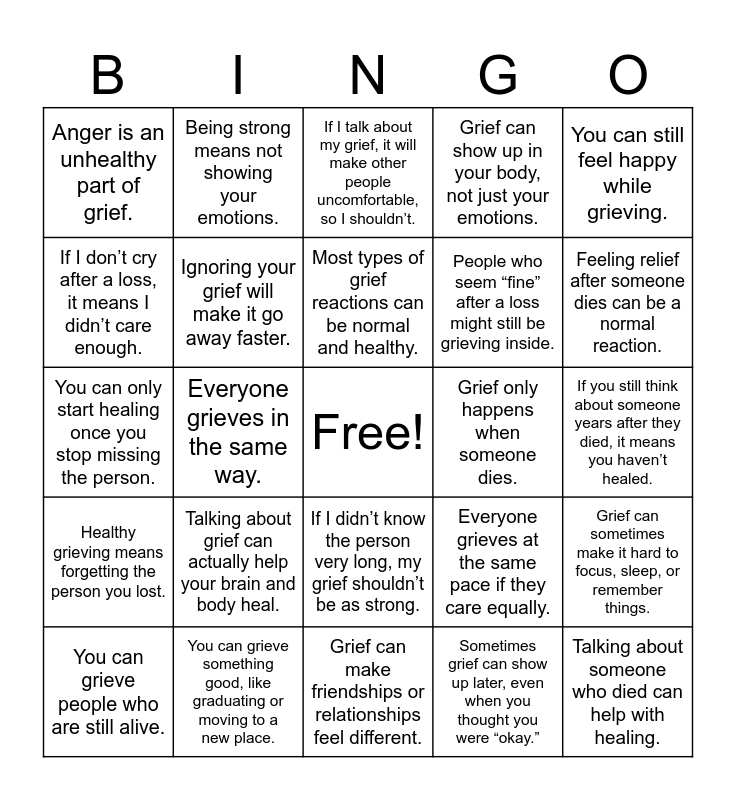 This bingo card has a free space and 24 words: You can grieve people who are still alive., Talking about grief can actually help your brain and body heal., Most types of grief reactions can be normal and healthy., Sometimes grief can show up later, even when you thought you were “okay.”, You can still feel happy while grieving., Anger is an unhealthy part of grief., Being strong means not showing your emotions., If I talk about my grief, it will make other people uncomfortable, so I shouldn’t., Grief only happens when someone dies., If you still think about someone years after they died, it means you haven’t healed., You can only start healing once you stop missing the person., Ignoring your grief will make it go away faster., Everyone grieves at the same pace if they care equally., Grief can sometimes make it hard to focus, sleep, or remember things., If I don’t cry after a loss, it means I didn’t care enough., You can grieve something good, like graduating or moving to a new place., Grief can make friendships or relationships feel different., Grief can show up in your body, not just your emotions., Feeling relief after someone dies can be a normal reaction., Healthy grieving means forgetting the person you lost., Everyone grieves in the same way., If I didn’t know the person very long, my grief shouldn’t be as strong., People who seem “fine” after a loss might still be grieving inside. and Talking about someone who died can help with healing..
