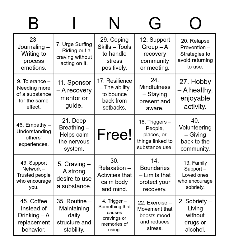 This bingo card has a free space and 50 words: 1. Detox – Removing toxins from the body., 2. Sobriety – Living without drugs or alcohol., 3. Relapse – Returning to substance use after abstinence., 4. Trigger – Something that causes cravings or memories of using., 5. Craving – A strong desire to use a substance., 6. Temptation – Feeling drawn toward something risky., 7. Urge Surfing – Riding out a craving without acting on it., 8. Withdrawal – Symptoms after stopping substance use., 9. Tolerance – Needing more of a substance for the same effect., 10. Accountability Partner – Someone who helps you stay on track., 11. Sponsor – A recovery mentor or guide., 12. Support Group – A recovery community or meeting., 13. Family Support – Loved ones who encourage sobriety., 14. Boundaries – Limits that protect your recovery., 15. Honesty – Being truthful about struggles and progress., 16. Acceptance – Acknowledging what you can and can’t control., 17. Resilience – The ability to bounce back from setbacks., 18. Triggers – People, places, or things linked to substance use., 19. Recovery Plan – A structured guide for staying sober., 20. Relapse Prevention – Strategies to avoid returning to use., 21. Deep Breathing – Helps calm the nervous system., 22. Exercise – Movement that boosts mood and reduces stress., 23. Journaling – Writing to process emotions., 24. Mindfulness – Staying present and aware., 25. Meditation – A quiet practice to focus and relax., 26. Therapy – Talking with a counselor for support., 27. Hobby – A healthy, enjoyable activity., 28. Gratitude – Focusing on what you’re thankful for., 29. Coping Skills – Tools to handle stress positively., 30. Relaxation – Activities that calm body and mind., 31. Positive Thinking – Reframing negative thoughts., 32. Grounding – Focusing on the present moment to reduce anxiety., 33. Assertiveness – Expressing needs respectfully., 34. Self-Care – Taking time to nurture yourself., 35. Routine – Maintaining daily structure and stability., 36. Sleep Hygiene – Prioritizing rest for emotional balance., 37. Healthy Eating – Fueling your body with nutritious foods., 38. Music Therapy – Using music to regulate emotions., 39. Art Therapy – Expressing feelings creatively., 40. Volunteering – Giving back to the community., 41. Celebrate Small Wins – Recognizing progress in recovery., 42. New Friendships – Building a sober support network., 43. Stress – Pressure that needs healthy outlets., 44. Anxiety – Nervousness that can trigger use., 45. Coffee Instead of Drinking – A replacement behavior., 46. Empathy – Understanding others’ experiences., 47. Forgiveness – Letting go of resentment., 48. Hope – Believing recovery is possible., 49. Support Network – Trusted people who encourage you. and 50. Balance – Creating harmony in work, rest, and recovery..