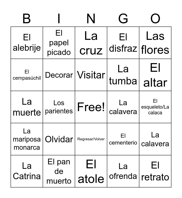 This bingo card has a free space and 28 words: La calavera, La vela, La tumba, La ofrenda, El cempasúchil, La cruz, El papel picado, La mariposa monarca, La calavera, La Catrina, La muerte, El disfraz, El pan de muerto, El atole, El altar, Recordar, Olvidar, Decorar, Visitar, Regresar/Volver, El alebrije, El espíritu, El retrato, Los parientes, El esqueleto/La calaca, El cementerio, Las flores and El alma.