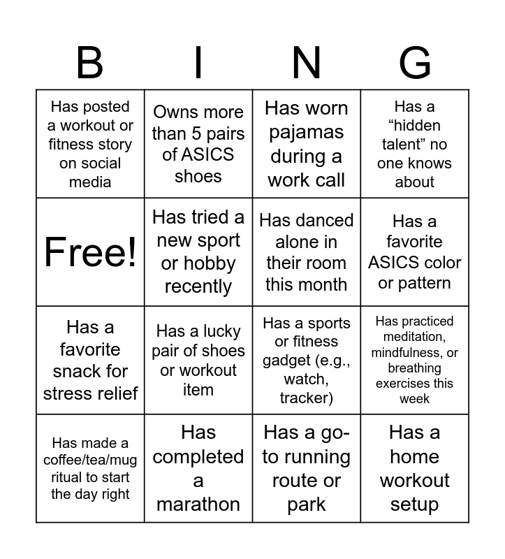 This bingo card has 16 words: Has completed a marathon, Has practiced meditation, mindfulness, or breathing exercises this week, Has worn pajamas during a work call, Has posted a workout or fitness story on social media, Has a favorite snack for stress relief, Owns more than 5 pairs of ASICS shoes, Has a sports or fitness gadget (e.g., watch, tracker), Has a go-to running route or park, Free!, Has tried a new sport or hobby recently, Has made a coffee/tea/mug ritual to start the day right, Has a “hidden talent” no one knows about, Has a lucky pair of shoes or workout item, Has a favorite ASICS color or pattern, Has danced alone in their room this month and Has a home workout setup.