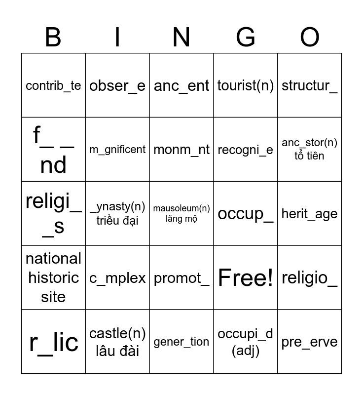 This bingo card has 25 words: c_mplex, gener_tion, monm_nt, r_lic, structur_, contrib_te, f_ _ nd, obser_e, occup_, promot_, recogni_e, religi_ _s, Free!, religio_, m_gnificent, pre_erve, herit_age, anc_ent, anc_stor(n) tổ tiên, _ynasty(n) triều đại, mausoleum(n) lăng mộ, castle(n) lâu đài, national historic site, tourist(n) and occupi_d (adj).