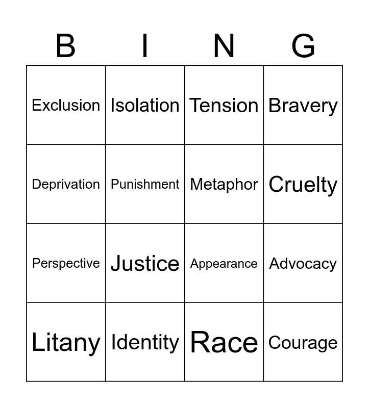 This bingo card has 25 words: Fairness, Respect, Cruelty, Prejudice, Deprivation, Exclusion, Punishment, Isolation, Identity, Oppression, Perspective, Appearance, Empathy, Repetition, Metaphor, Literacy, Race, Tension, Justice, Advocacy, Litany, Survival, Courage, Bravery and Stereotype.