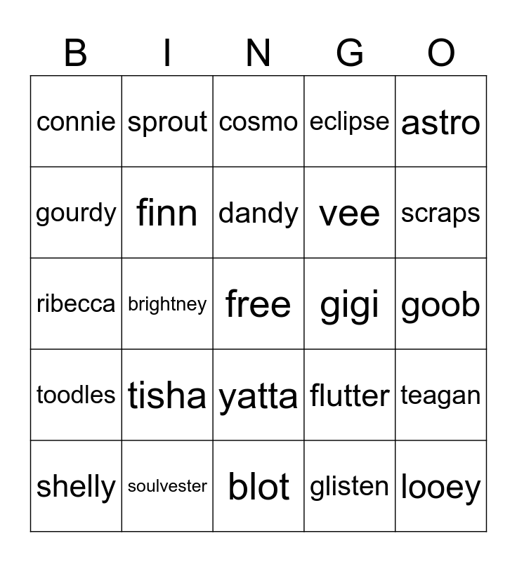 This bingo card has a free space and 31 words: blot, boxten, brightney, brusha, connie, cosmo, finn, flutter, gigi, glisten, goob, looey, poppy, razzle and dazzle, scraps, shrimpo, teagan, tisha, toodles, yatta, astro, pebble, shelly, sprout, vee, gourdy, eclipse, ribecca, soulvester, dandy and dyle.