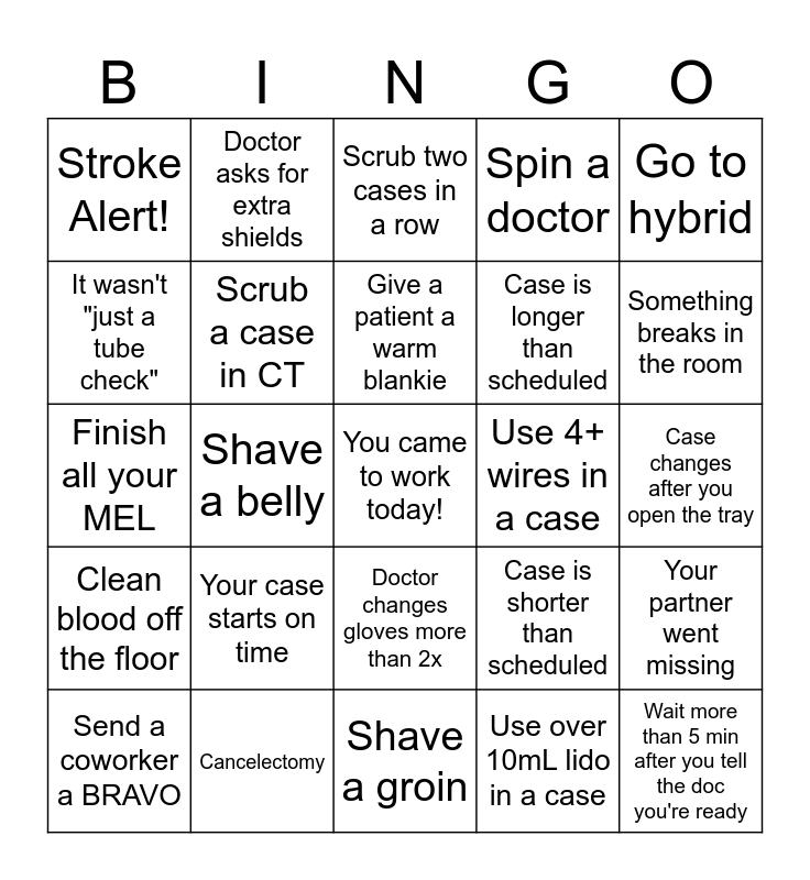 This bingo card has a free space and 24 words: Your case starts on time, Cancelectomy, Give a patient a warm blankie, Send a coworker a BRAVO, Go to hybrid, Stroke Alert!, It wasn't "just a tube check", Doctor asks for extra shields, Use 4+ wires in a case, Doctor changes gloves more than 2x, Case is longer than scheduled, Finish all your MEL, Case is shorter than scheduled, Your partner went missing, Scrub a case in CT, Use over 10mL lido in a case, Case changes after you open the tray, Scrub two cases in a row, Something breaks in the room, Shave a belly, Wait more than 5 min after you tell the doc you're ready, Clean blood off the floor, Spin a doctor and Shave a groin.