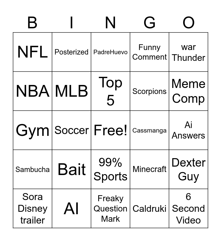 This bingo card has a free space and 24 words: Bait, AI, Top 5, Sora Disney trailer, war Thunder, NFL, NBA, Posterized, Cassmanga, 99% Sports, Scorpions, Gym, Minecraft, Dexter Guy, MLB, Caldruki, Ai Answers, PadreHuevo, Meme Comp, Soccer, 6 Second Video, Sambucha, Funny Comment and Freaky Question Mark.