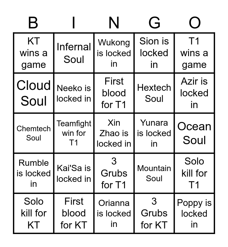 This bingo card has 26 words: 3 Grubs for T1, 3 Grubs for KT, First blood for T1, First blood for KT, T1 wins a game, KT wins a game, Cloud Soul, Infernal Soul, Ocean Soul, Mountain Soul, Hextech Soul, Chemtech Soul, Solo kill for T1, Solo kill for KT, Teamfight win for T1, Teamfight win for KT, Sion is locked in, Rumble is locked in, Wukong is locked in, Xin Zhao is locked in, Azir is locked in, Orianna is locked in, Yunara is locked in, Kai'Sa is locked in, Neeko is locked in and Poppy is locked in.