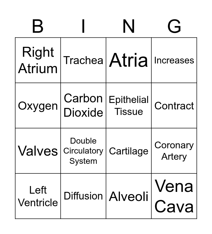 This bingo card has 16 words: Diffusion, Coronary Artery, Atria, Right Atrium, Valves, Trachea, Cartilage, Alveoli, Oxygen, Carbon Dioxide, Left Ventricle, Increases, Double Circulatory System, Contract, Epithelial Tissue and Vena Cava.