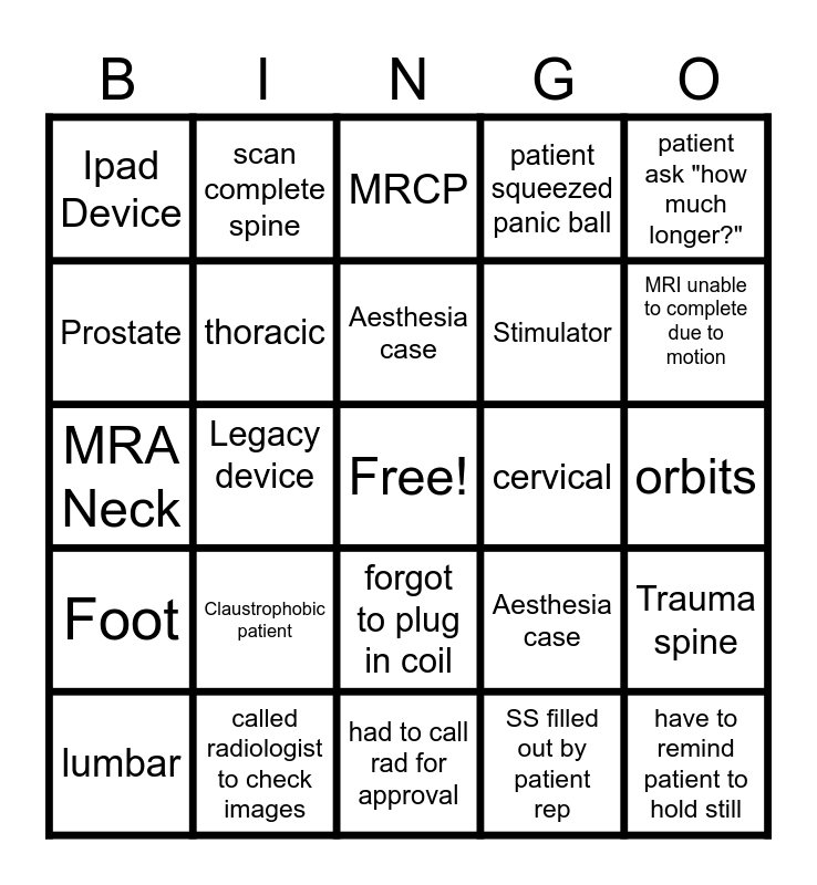 This bingo card has a free space and 24 words: Claustrophobic patient, called radiologist to check images, Aesthesia case, lumbar, patient ask "how much longer?", Ipad Device, Prostate, scan complete spine, cervical, forgot to plug in coil, Stimulator, MRA Neck, Aesthesia case, Trauma spine, thoracic, SS filled out by patient rep, orbits, MRCP, MRI unable to complete due to motion, Legacy device, have to remind patient to hold still, Foot, patient squeezed panic ball and had to call rad for approval.