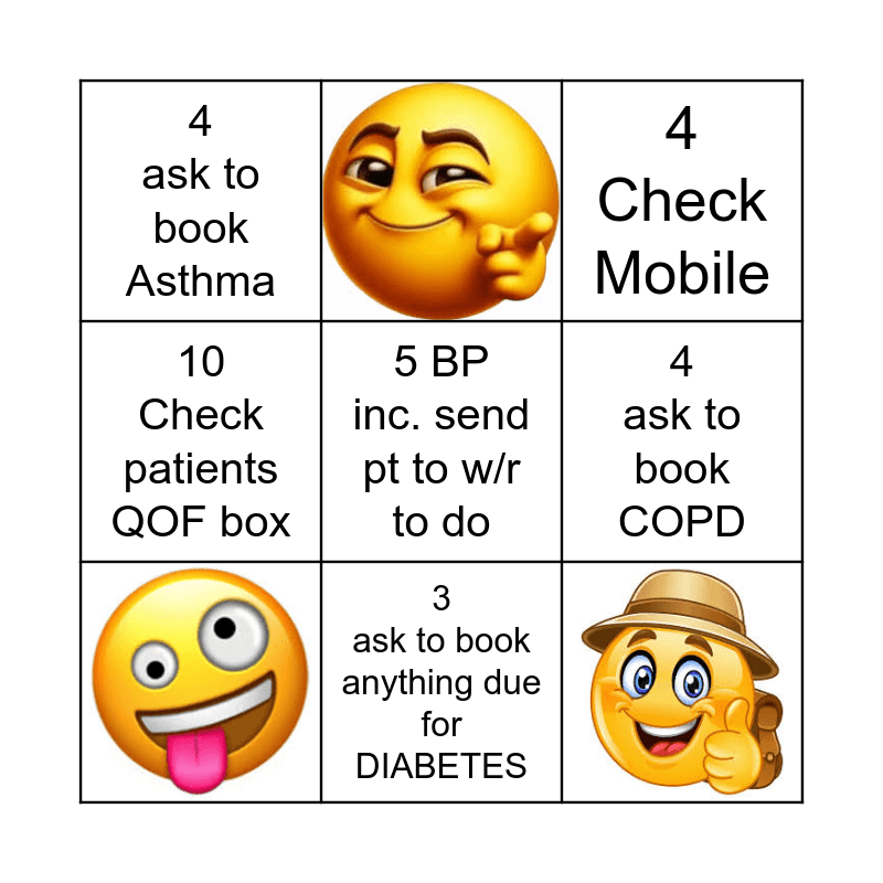 This bingo card has 3 images and 6 words: 5 BP inc. send pt to w/r to do, 4 Check Mobile, 4 ask to book Asthma, 4 ask to book COPD, 10 Check patients QOF box and 3 ask to book anything due for DIABETES.