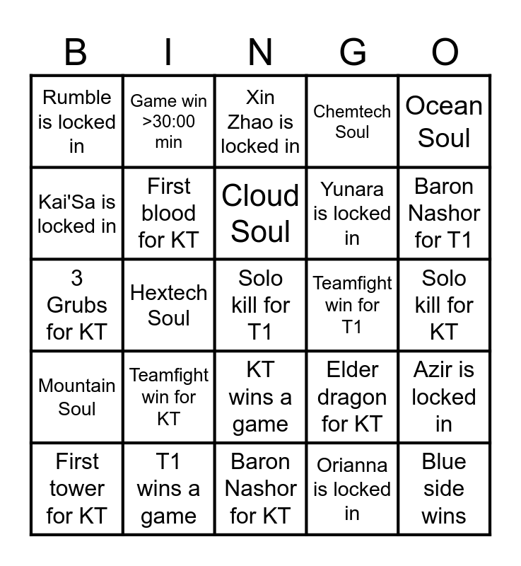 This bingo card has 40 words: 3 Grubs for T1, 3 Grubs for KT, First blood for T1, First blood for KT, T1 wins a game, KT wins a game, Cloud Soul, Infernal Soul, Ocean Soul, Mountain Soul, Hextech Soul, Chemtech Soul, Solo kill for T1, Solo kill for KT, Teamfight win for T1, Teamfight win for KT, Sion is locked in, Rumble is locked in, Wukong is locked in, Xin Zhao is locked in, Azir is locked in, Orianna is locked in, Yunara is locked in, Kai'Sa is locked in, Neeko is locked in, Poppy is locked in, Feats of strength for T1, Feats of strength for KT, Blue side wins, Red side wins, First tower for T1, First tower for KT, Elder dragon for T1, Elder dragon for KT, Baron Nashor for T1, Baron Nashor for KT, Baron Nashor gets stolen, Game win <30:00 min, Game win >30:00 min and <10% PB champion gets picked.