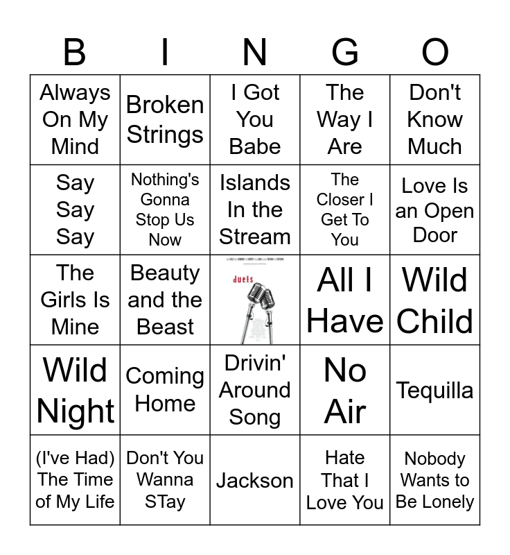 This bingo card has a free space and 74 words: You're The One That I Want, Dancing in the Street, I Got You Babe, Shallow, Don't Go Breaking My Heart, It Takes Two, Perfect Duet, Don't Let the Sun Go Down on Me, (I've Had) The Time of My Life, Up Where We Belong, Ain't No Mountain High Enough, Endless Love, Islands In the Stream, Say Say Say, Hips Don't Lie, Beauty and the Beast, A Whole New World, Love Is an Open Door, True Colors, The Girls Is Mine, Nothing's Gonna Stop Us Now, Broken Strings, The Way I Are, Dilemma, Nobody Wants to Be Lonely, All I Have, I Knew You Were Waiting, When You're Gone, Timber, No Air, Don't Know Much, Say Something, Promiscuous, Stay, Baby Boy, Hate That I Love You, Breathe, Empire State Of Mind, Cheap Thrills, Girls Like, Jackson, Don't You Wanna STay, We Were Us, Different For Girls, Setting the World On Fire, Always On My Mind, Highway Don't Care, Coming Home, Drowns The Whiskey, Goodbye Summer, Go Ahead and Break My Heart, Lonely Tonight, Wild Child, Remind Me, You and Tequilla, Let's Make Love, Drivin' Around Song, When I Get Where I'm Going, My Eyes, Tequilla, The Closer I Get To You, I'm Your Angel, Wild Night, The Next Time I Fall, All I Have, No More Tears, Friends And Lovers, Stop Draggin' My Heart Around, No Air, Easy Lover, Baby, Come To Me, Nobody, You Don't Have to Be a Star and You Don't Bring Me Flowers.