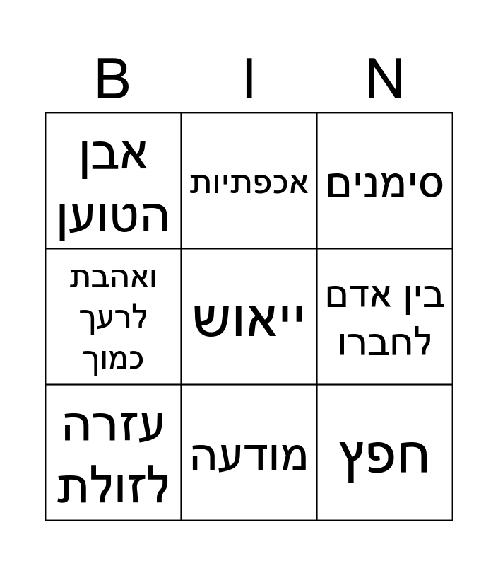 This bingo card has 15 words: אבידה, מוצא, סימנים, אבן הטוען, מודעה, ייאוש, שווה פרוטה, מצוות עשה, בין אדם לחברו, חפץ, בעלים, ואהבת לרעך כמוך, עזרה לזולת, אכפתיות and לחפש.