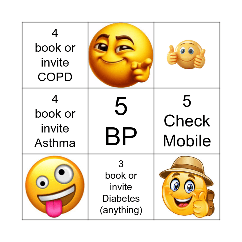 This bingo card has 4 images and 5 words: 5 BP, 4 book or invite COPD, 5 Check Mobile, 4 book or invite Asthma and 3 book or invite Diabetes (anything).