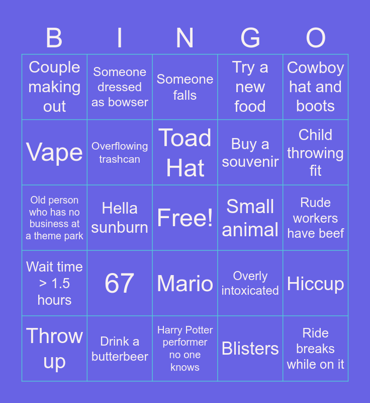 This bingo card has a free space and 24 words: 67, Drink a butterbeer, Toad Hat, Throw up, Cowboy hat and boots, Couple making out, Vape, Someone dressed as bowser, Small animal, Mario, Buy a souvenir, Old person who has no business at a theme park, Overly intoxicated, Hiccup, Overflowing trashcan, Blisters, Rude workers have beef, Someone falls, Child throwing fit, Hella sunburn, Ride breaks while on it, Wait time > 1.5 hours, Try a new food and Harry Potter performer no one knows.