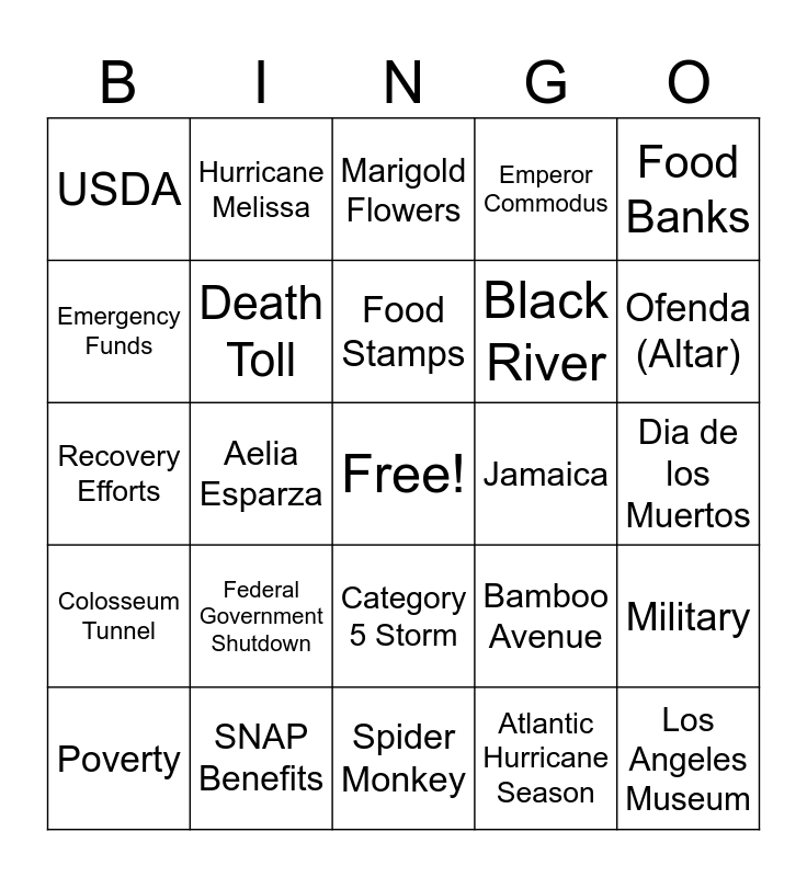 This bingo card has a free space and 24 words: Federal Government Shutdown, SNAP Benefits, Food Stamps, Poverty, Food Banks, USDA, Emergency Funds, Hurricane Melissa, Jamaica, Category 5 Storm, Black River, Recovery Efforts, Bamboo Avenue, Military, Death Toll, Atlantic Hurricane Season, Dia de los Muertos, Marigold Flowers, Ofenda (Altar), Aelia Esparza, Los Angeles Museum, Colosseum Tunnel, Emperor Commodus and Spider Monkey.