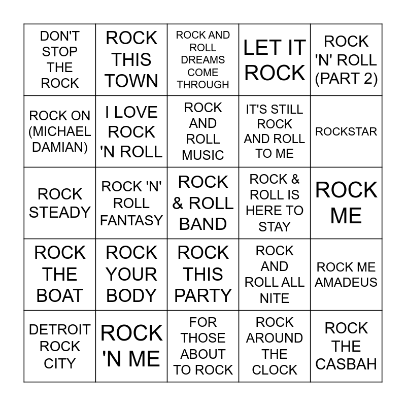This bingo card has 55 words: CROCODILE ROCK, DETROIT ROCK CITY, DON'T ROCK THE JUKEBOX, DON'T STOP THE ROCK, FOR THOSE ABOUT TO ROCK, HOT ROCKIN', I LOVE ROCK 'N ROLL, I WANNA ROCK, IT'S STILL ROCK AND ROLL TO ME, JAILHOUSE ROCK, LET IT ROCK, LET'S GET ROCKED, OLD TIME ROCK & ROLL, PARTY LIKE A ROCK STAR, PARTY ROCK ANTHEM, R,O.C.K. IN THE USA, ROCK 'N' ROLL (PART 2), ROCK 'N' ROLL FANTASY, ROCK 'N' ROLL STAR, ROCK & ROLL BAND, ROCK & ROLL IS HERE TO STAY, ROCK AND ROLL, ROCK AND ROLL ALL NITE, ROCK AND ROLL DREAMS COME THROUGH, ROCK AND ROLL GIRLS, ROCK AND ROLL MUSIC, ROCK AROUND THE CLOCK, ROCK LOBSTER, ROCK ME, ROCK ME AMADEUS, ROCK MY WORLD (LITTLE COUNTRY GIRL), ROCK N ROLL TRAIN, ROCK OF AGES, ROCK ON (DAVID ESSEX), ROCK ON (MICHAEL DAMIAN), ROCK STEADY, ROCK THAT BODY, ROCK THE BOAT, ROCK THE CASBAH, ROCK THE NIGHT, ROCK THIS TOWN, ROCK WIT U, ROCK WITH YOU, ROCK YOU LIKE A HURRICANE, ROCK YOUR BODY, ROCK 'N ME, ROCKIN' IN THE FREE WORLD, ROCKIN' ROBIN, ROCKIT, ROCKSTAR, THE HEART OF ROCK & ROLL, THE ROCK SHOW, WE WILL ROCK YOU, ROCK THIS PARTY and ROCKET.