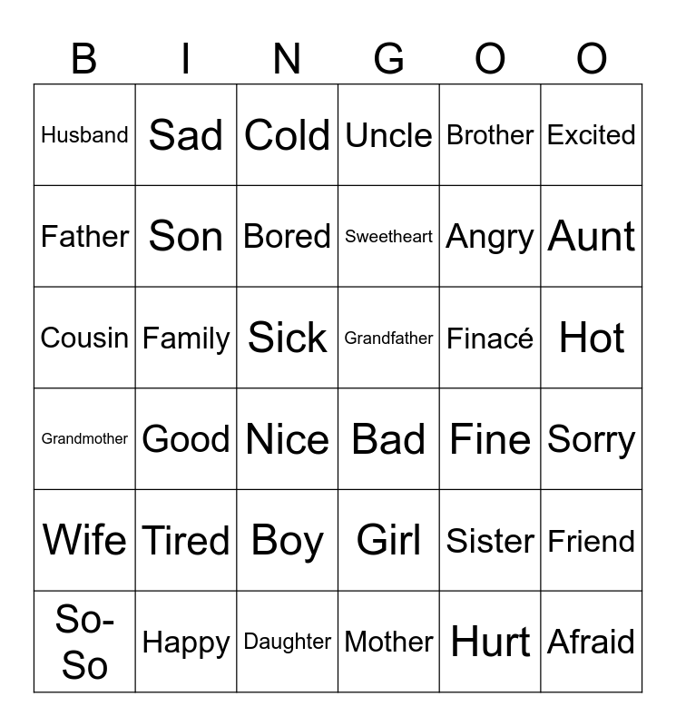 This bingo card has 36 words: Girl, Boy, Mother, Father, Grandmother, Grandfather, Son, Daughter, Brother, Sister, Aunt, Uncle, Friend, Family, Sweetheart, Husband, Wife, Finacé, Cousin, Cold, Sick, Good, Bad, Nice, Fine, Sad, Angry, Happy, Bored, Excited, Afraid, So-So, Sorry, Hot, Tired and Hurt.