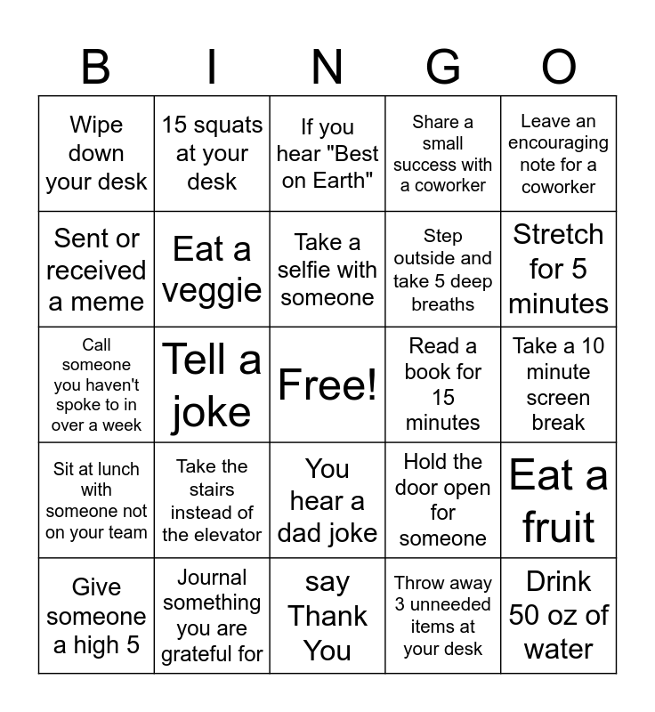 This bingo card has a free space and 24 words: Take the stairs instead of the elevator, Journal something you are grateful for, Take a selfie with someone, Give someone a high 5, Leave an encouraging note for a coworker, Wipe down your desk, Sent or received a meme, 15 squats at your desk, Read a book for 15 minutes, You hear a dad joke, Step outside and take 5 deep breaths, Call someone you haven't spoke to in over a week, Hold the door open for someone, Eat a fruit, Eat a veggie, Throw away 3 unneeded items at your desk, Take a 10 minute screen break, If you hear "Best on Earth", Stretch for 5 minutes, Tell a joke, Drink 50 oz of water, Sit at lunch with someone not on your team, Share a small success with a coworker and say Thank You.