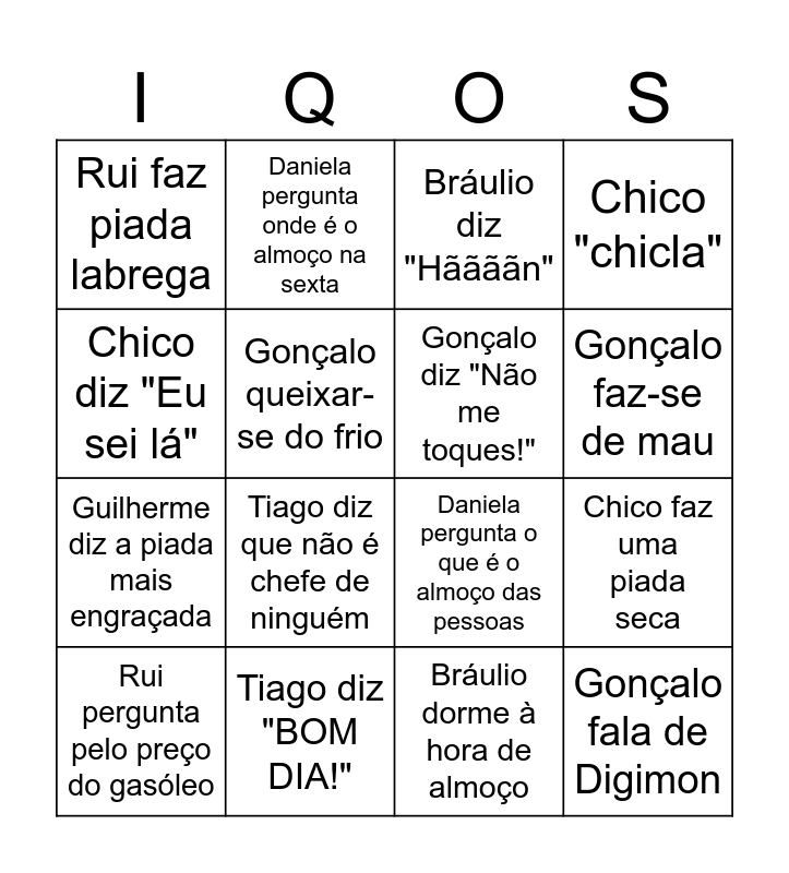 This bingo card has 36 words: Braúlio diz "hãããã?", Diogo ser labrego, Diogo dizer +1, Gonçalo diz "Não me toques!", Gonçalo diz "MIMIMI", Gonçalo fala de Digimon, Gonçalo faz-se de mau, Gonçalo usar os outros nas piadas, Chico diz "Eu sei lá", Chico come um docinho, Chico faz uma piada seca, Chico "chicla", Tiago goza com Daniela, Tiago diz "BOM DIA!", Tiago diz que não é chefe de ninguém, Rui faz piada labrega, Rui diz "traz uma bilha", Rui pergunta "Gostas de cá 'tar?", Rui pergunta pelo preço do gasóleo, Bráulio diz "Hããããn", Bráulio dorme à hora de almoço, Bráulio goza com o Diogo, Não se percebe o que o Bráulio disse, Daniela põe os fones quando se fala em labrejice, Daniela diz "2€!!!", Daniela pergunta onde é o almoço na sexta, Daniela pergunta o que é o almoço das pessoas, Ana é extraordinária, Guilherme diz a piada mais engraçada, Gonçalo queixar-se do frio, Sofia queixar-se do frio, Diogo amuar, Diogo veste camisola de bonecada, Diogo faz piadas secas, Diogo exagerar and Diogo queixar-se.