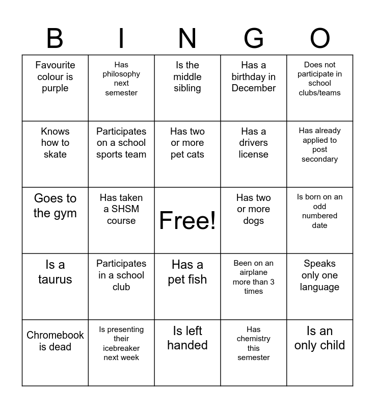 This bingo card has a free space and 25 words: Chromebook is dead, Participates in a school club, Has two or more pet cats, Has chemistry this semester, Has already applied to post secondary, Favourite colour is purple, Has philosophy next semester, Is the middle sibling, Has a drivers license, Speaks only one language, Goes to the gym, Participates on a school sports team, Been on an airplane more than 3 times, Is an only child, Knows how to skate, Is presenting their icebreaker next week, Is left handed, Has a birthday in December, Is born on an odd numbered date, Is a taurus, Has taken a SHSM course, Has a pet fish, Has two or more dogs, Does not participate in school clubs/teams and Does not participate in any school clubs/teams.