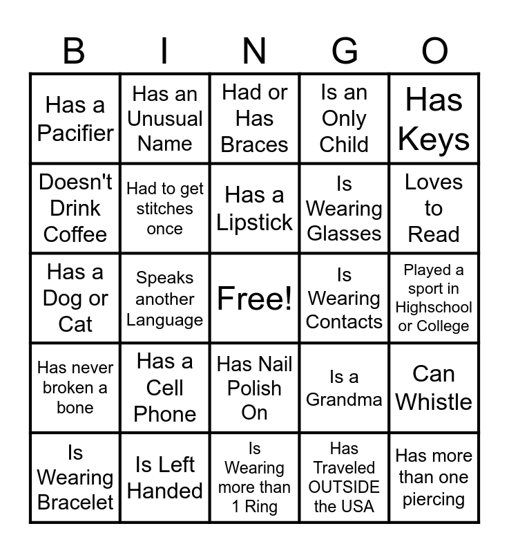 This bingo card has a free space and 24 words: Has a Cell Phone, Is Left Handed, Has a Lipstick, Is Wearing Bracelet, Has Keys, Has a Pacifier, Doesn't Drink Coffee, Has an Unusual Name, Is Wearing Contacts, Has Nail Polish On, Is Wearing Glasses, Has a Dog or Cat, Is a Grandma, Can Whistle, Had to get stitches once, Has Traveled OUTSIDE the USA, Played a sport in Highschool or College, Had or Has Braces, Loves to Read, Speaks another Language, Has more than one piercing, Has never broken a bone, Is an Only Child and Is Wearing more than 1 Ring.