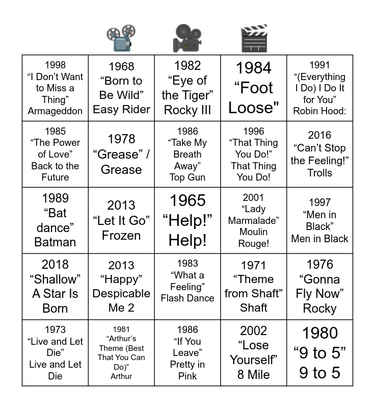 This bingo card has 35 words: 1967 “Mrs. Robinson” The Graduate, 1969 “Raindrops Keep Fallin’" Butch Cassidy and Sundance Kid, 1977 “Stayin’ Alive” Saturday Night Fever, 1978 “Grease” / Grease, 1983 “What a Feeling” Flash Dance, 1984 “Foot Loose", 1985 “The Power of Love” Back to the Future, 1984 Ghost Busters, 1986 “Take My Breath Away” Top Gun, 1985 “Don’t You (Forget About Me)” The Breakfast Club, 1989 “Bat dance” Batman, 1991 “(Everything I Do) I Do It for You” Robin Hood:, 1993 “Streets of Philadelphia” Philadelphia, 1995 “Kiss from a Rose” Batman Forever, 1998 “I Don’t Want to Miss a Thing” Armageddon, 2001 “Lady Marmalade” Moulin Rouge!, 2002 “Lose Yourself” 8 Mile, 2013 “Let It Go” Frozen, 2018 “Shallow” A Star Is Born, 1965 “Help!” Help!, 1971 “Theme from Shaft” Shaft, 1973 “Live and Let Die” Live and Let Die, 1976 “Gonna Fly Now” Rocky, 1981 “Arthur’s Theme (Best That You Can Do)” Arthur, 1982 “Eye of the Tiger” Rocky III, 2016 “Can’t Stop the Feeling!” Trolls, 1980 “9 to 5” 9 to 5, 1987 “Who’s That Girl” Who’s That Girl, 1996 “That Thing You Do!” That Thing You Do!, 1997 “Men in Black” Men in Black, “Bohemian Rhapsody” Wayne’s World (1992 use), 1986 “If You Leave” Pretty in Pink, 2013 “Happy” Despicable Me 2, 1968 “Born to Be Wild” Easy Rider and 2003 “Accidentally in Love” Shrek 2.