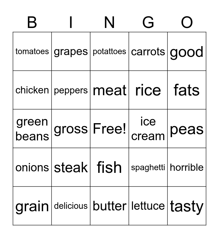 This bingo card has a free space and 24 words: steak, delicious, meat, grain, good, tomatoes, chicken, grapes, ice cream, fish, rice, green beans, spaghetti, horrible, peppers, lettuce, peas, potattoes, fats, gross, tasty, onions, carrots and butter.