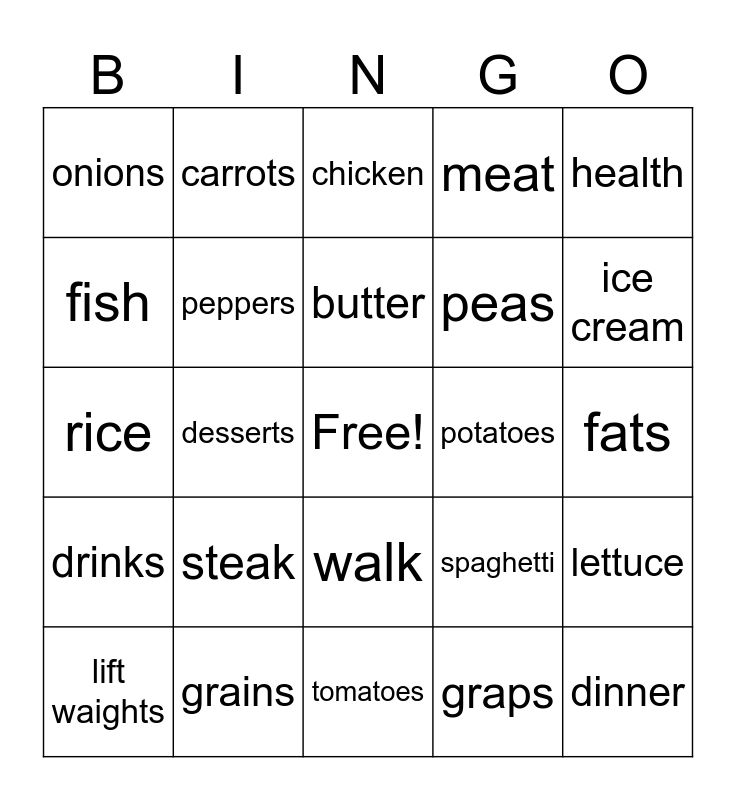 This bingo card has a free space and 24 words: steak, grains, butter, lift waights, health, onions, fish, carrots, potatoes, walk, peas, rice, spaghetti, lettuce, peppers, graps, fats, chicken, ice cream, desserts, dinner, drinks, meat and tomatoes.