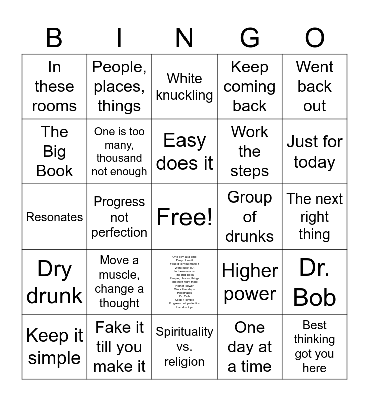 This bingo card has a free space and 26 words: One day at a time Easy does it Fake it till you make it Went back out In these rooms The Big Book People, places, things The next right thing Higher power Work the steps Resonates Dr. Bob Keep it simple Progress not perfection It works if yo, One day at a time, Easy does it, Fake it till you make it, Went back out, In these rooms, The Big Book, People, places, things, The next right thing, Higher power, Work the steps, Resonates, Dr. Bob, Keep it simple, Progress not perfection, It works if you work it, Keep coming back, Dry drunk, White knuckling, Best thinking got you here, Just for today, Spirituality vs. religion, Group of drunks, Move a muscle, change a thought, One is too many, thousand not enough and Stick with the winners.