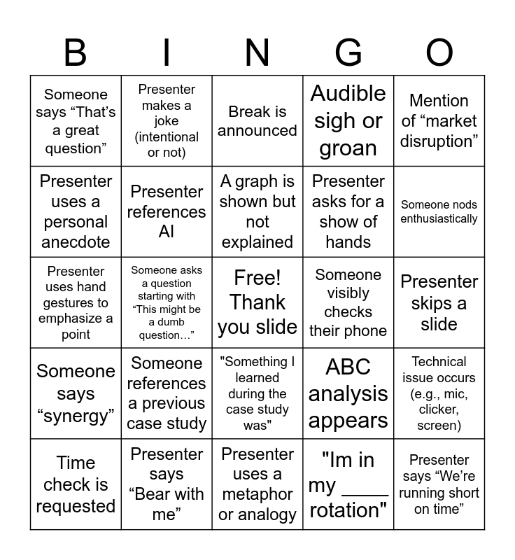 This bingo card has a free space and 36 words: Presenter says “Let’s circle back”, A slide has more than 50 words, Acronym is used without explanation, Presenter references AI, ABC analysis appears, Someone says “synergy”, A graph is shown but not explained, Presenter says “This is a busy slide”, Mention of “market disruption”, A quote from someone at Dell, Someone asks a question starting with “This might be a dumb question…”, Audible sigh or groan, Someone takes a photo of a slide, Someone visibly checks their phone, Someone nods enthusiastically, Someone says “That’s a great question”, Someone asks for clarification on a metric, Someone references a previous case study, Presenter says “We’re running short on time”, Break is announced, Presenter skips a slide, Technical issue occurs (e.g., mic, clicker, screen), Presenter says “Bear with me”, Time check is requested, Presenter uses a metaphor or analogy, Presenter makes a joke (intentional or not), Presenter uses hand gestures to emphasize a point, Presenter says “Can everyone see this?”, Presenter asks for a show of hands, Presenter uses a personal anecdote, Presenter referencing the shareholders, Presenter referencing a require reading, "Im in my ____ rotation", "Something I learned during the case study was", *power bi shows up* and "Handing it off to".