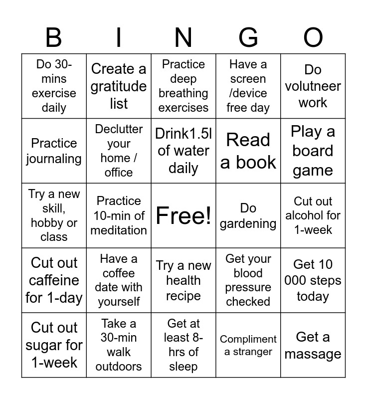This bingo card has a free space and 24 words: Have a coffee date with yourself, Take a 30-min walk outdoors, Drink1.5l of water daily, Cut out sugar for 1-week, Do volutneer work, Do 30-mins exercise daily, Practice journaling, Create a gratitude list, Do gardening, Try a new health recipe, Read a book, Try a new skill, hobby or class, Get your blood pressure checked, Get 10 000 steps today, Declutter your home / office, Compliment a stranger, Cut out alcohol for 1-week, Practice deep breathing exercises, Play a board game, Practice 10-min of meditation, Get a massage, Cut out caffeine for 1-day, Have a screen /device free day and Get at least 8-hrs of sleep.