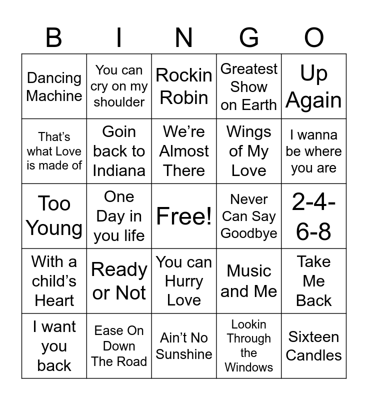 This bingo card has a free space and 29 words: I want you back, ABC, One Day in you life, I’ll be there, Dancing Machine, Rockin Robin, Goin back to Indiana, Ready or Not, Never Can Say Goodbye, Ease On Down The Road, 2-4-6-8, Sixteen Candles, Ain’t No Sunshine, Lookin Through the Windows, I wanna be where you are, You’ve Got A Friend, You can Hurry Love, With a child’s Heart, Up Again, Too Young, Music and Me, In Our Small Way, Wings of My Love, That’s what Love is made of, Greatest Show on Earth, You can cry on my shoulder, Take Me Back, We’re Almost There and You’ve Really Got a Hold on Me.
