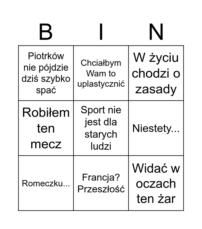 This bingo card has a free space and 8 words: Niestety..., W życiu chodzi o zasady, Chciałbym Wam to uplastycznić, Romeczku..., Piotrków nie pójdzie dziś szybko spać, Widać w oczach ten żar, Robiłem ten mecz and Francja? Przeszłość.