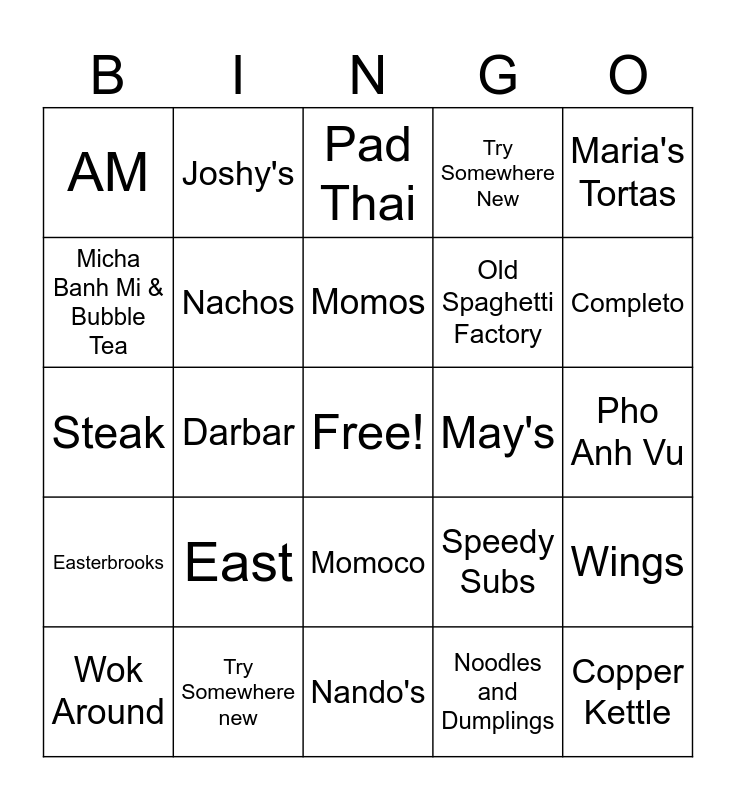 This bingo card has a free space and 24 words: East, Try Somewhere new, Momos, Wok Around, Maria's Tortas, AM, Micha Banh Mi & Bubble Tea, Joshy's, May's, Momoco, Old Spaghetti Factory, Steak, Speedy Subs, Wings, Nachos, Noodles and Dumplings, Pho Anh Vu, Pad Thai, Completo, Darbar, Copper Kettle, Easterbrooks, Try Somewhere New and Nando's.